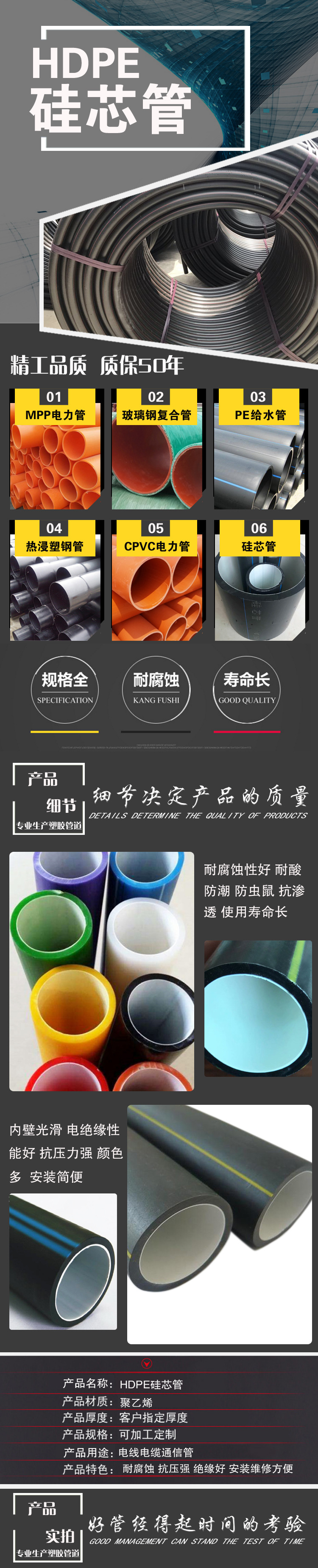 硅芯管是一種內(nèi)壁帶有硅膠質(zhì)固體潤(rùn)滑劑的新型復(fù)合管道,密封性能好, 耐化學(xué)腐蝕,工程造價(jià)低,廣泛運(yùn)用于高速公路,鐵路等的光電纜通信網(wǎng)絡(luò) 系統(tǒng)。HDPE硅芯管是一種內(nèi)壁帶有硅膠質(zhì)固體潤(rùn)滑劑的新型復(fù)合管道, 簡(jiǎn)稱硅管。由三臺(tái)塑料擠出機(jī)同步擠壓復(fù)合,主要原材料為高密度聚乙 烯,芯層為摩擦系數(shù)最低的固體潤(rùn)滑劑硅膠質(zhì)。廣泛運(yùn)用于光電纜通信 網(wǎng)絡(luò)系統(tǒng)。